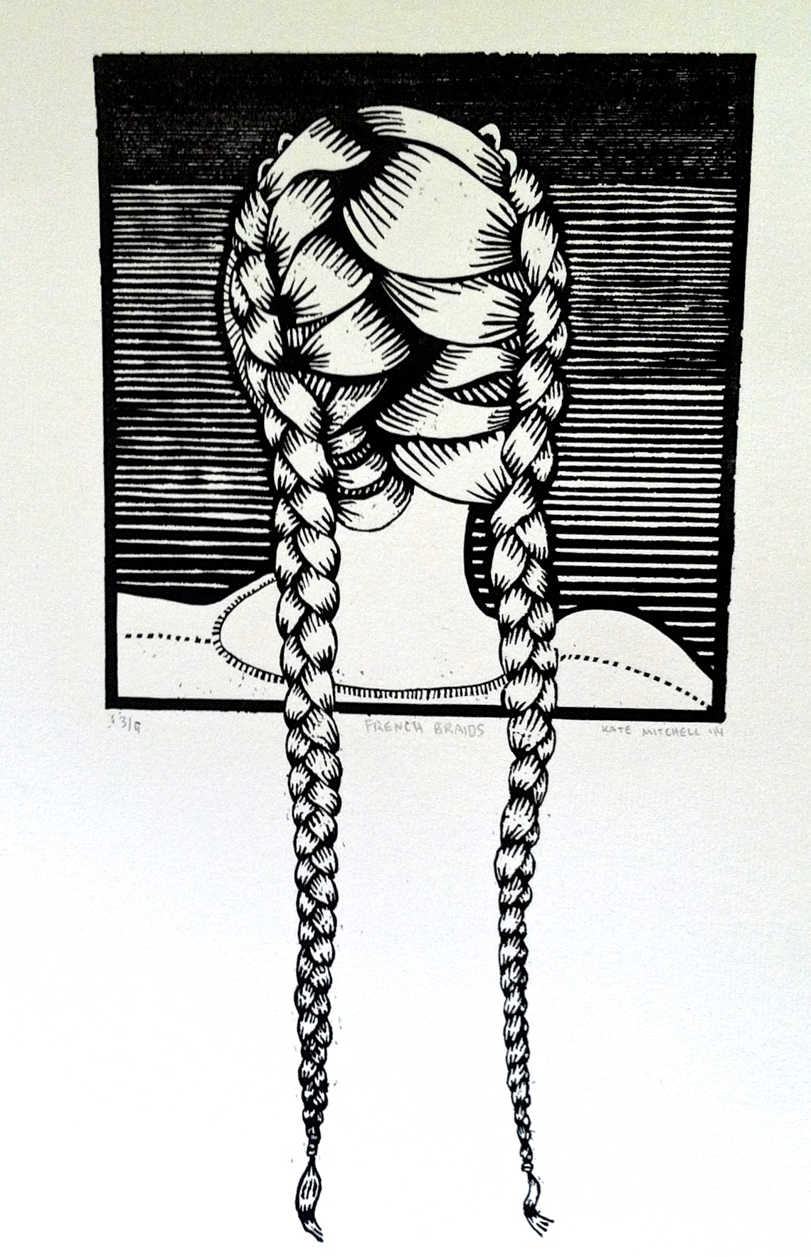 “French Braids,” 2014. Linocut on white Rives BFK 12” x 6 ¼”