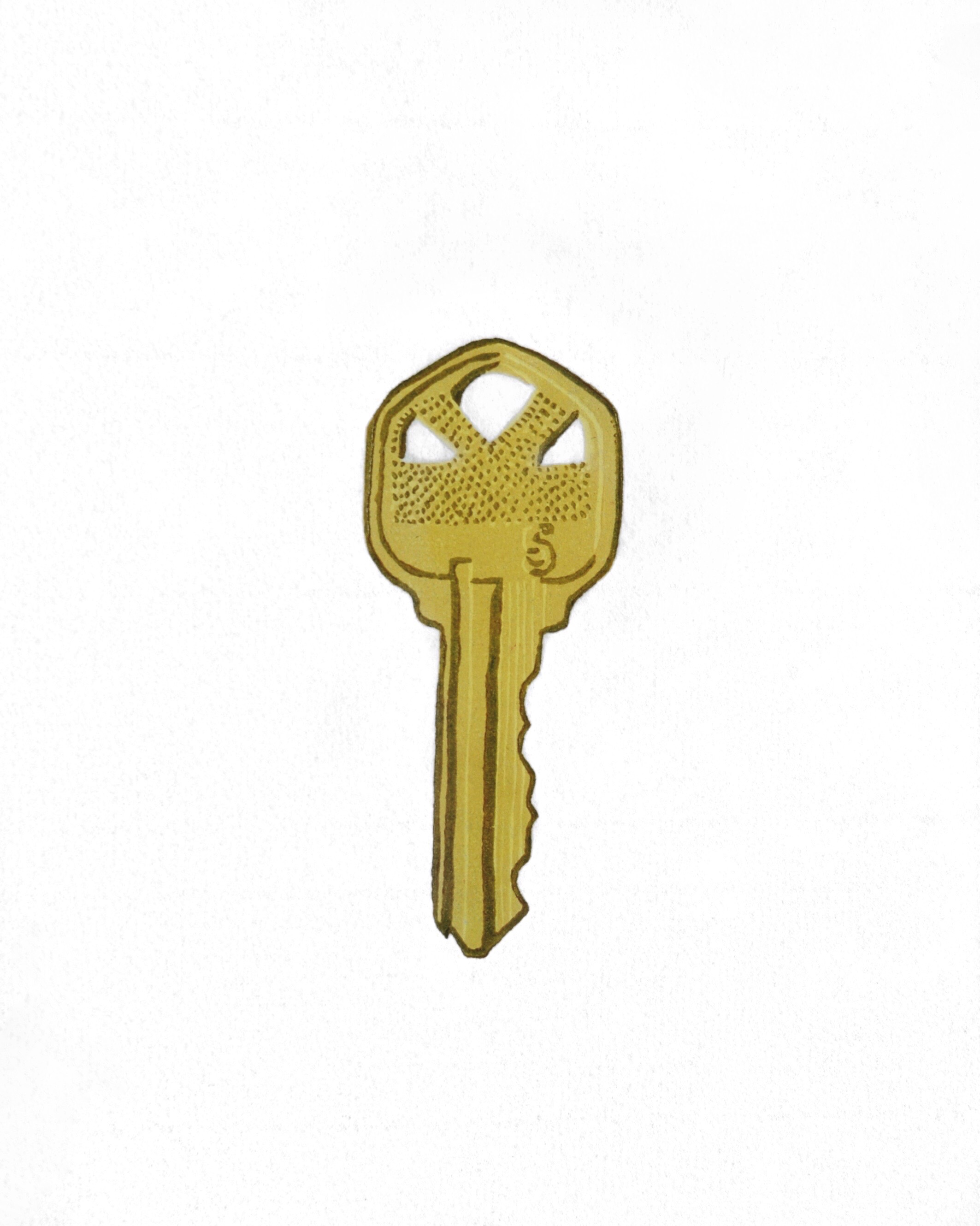 Key to Your New Home in the Kitchen on Halloween Night: Overwhelmed by Too Many Kids and Not Enough Candy, We Shut the Blinds and Watch the Menu of a DVD Loop Over and Over, Waiting for It to Play Since We Can’t Find the Remote, 2017 Linocut on Mulberry Image area: 3 1/16”x1 ¼” Sheet: 16”x16”